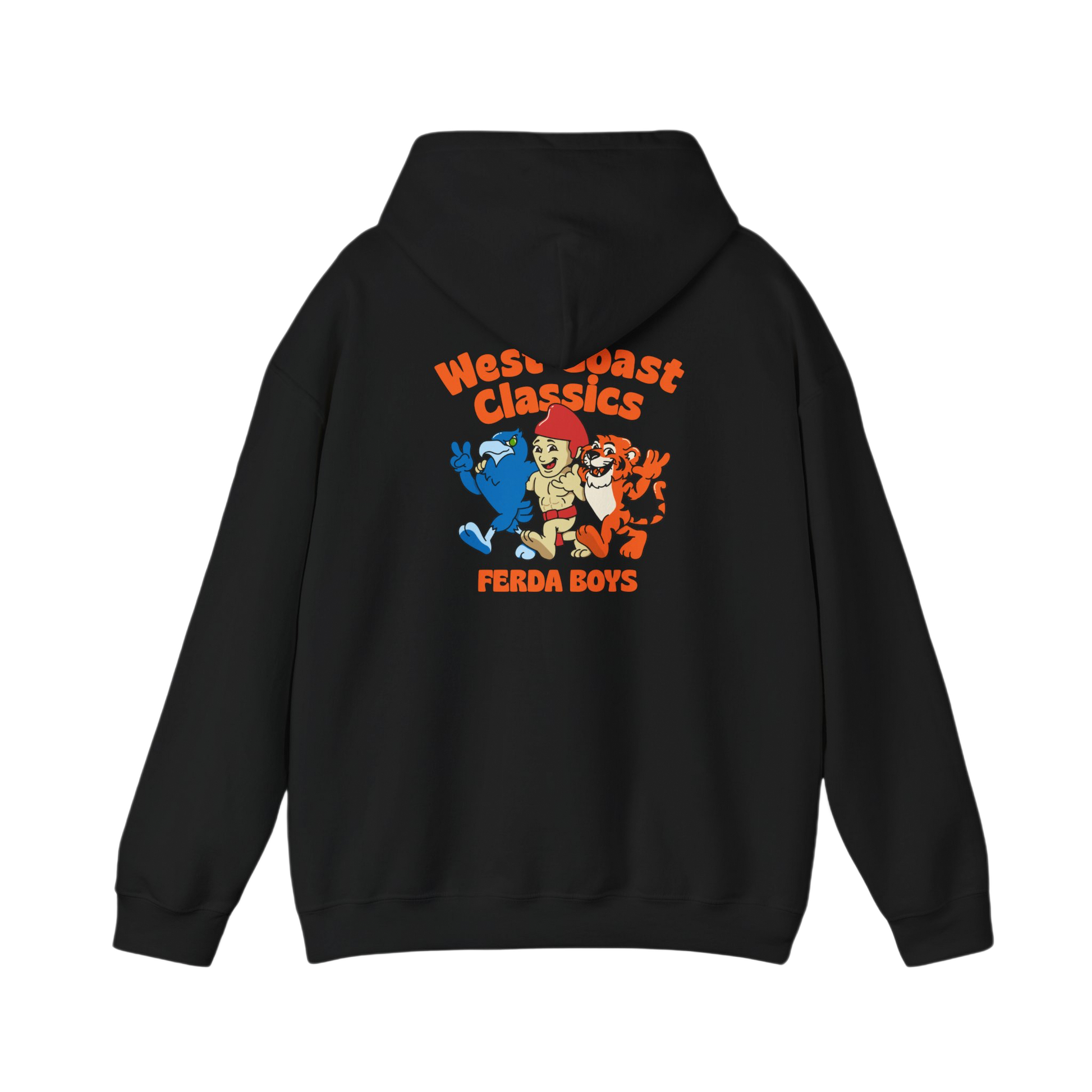 This cozy hooded sweatshirt carries a retro West Coast vibe — soft, warm, and a little mischievous. A small, grinning tiger logo sits over the heart, while the back shows a sun-soaked vintage cartoon crew in bold orange and blue with the phrase “West Coast Classics” and HSM-69 marking. It feels like an old-school skate flyer or a favorite record cover: worn-in warmth, playful attitude, and bright, nostalgic colors that stand out on a crisp morning. Wear it to layer over tees on weekend drives, to the local skate park, or when you want that easy, lived-in look that says you care about style without trying too hard.